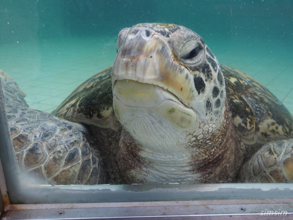 下田海中水族館の入口にいるのがこのウミガメです。
